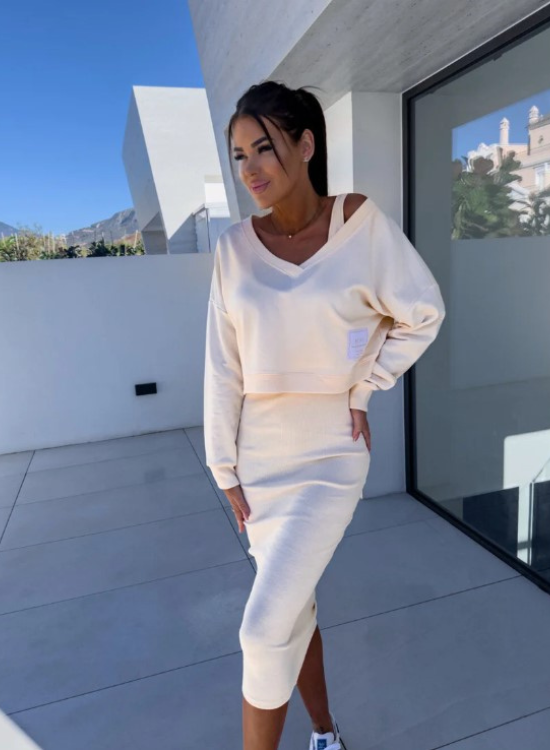 Cet ensemble féminin composé d’une jupe midi ajustée et d’un pull décontracté allie confort, modernité et élégance. Sa coupe flatteuse et sa matière douce en font un choix idéal pour un look tendance au quotidien.