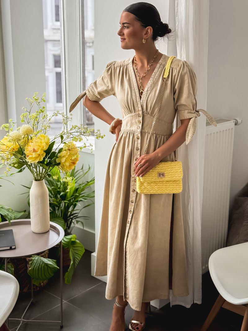 Les détails uniques de cette robe accentuent son charme, notamment des manches attachées avec de délicats rubans aux extrémités pour une touche ludique et chic. Que ce soit pour un brunch décontracté ou une soirée élégante, cette robe vous fera sentir au centre de l'attention, alliant confort et style incontestable.